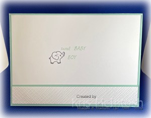 The greeting is attached to the top right hand corner of the card front. To decorate the inside of the card, I stamped “sweet Baby Boy” using the greetings from the Cradled in Love stamp set onto Basic White card using Pool Party ink. I stamped the elephant image from the same stamp set beside the greeting using Memento Tuxedo Black ink. I embossed a narrow strip of Basic White card using the same Basics 3D Embossing Folder as I used for the front of the card. I attached a narrow strip of Pool Party card behind one long edge and attached it across the bottom of the stamped card. The second version of the card uses exactly the same supplies except I used Bubble Bath Stampin’ Blends and Bubble Bath card and ink.