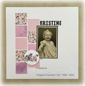 Today’s page shows off a photo of me when I was only one year old. I cut two different patterns from the Flight & Airy 12″ x 12″ Designer Series Paper three times using one of the squares from the Stylish Shapes Dies. I also cut Bubble Bath card three times using the same die. The squares are attached down the left hand side of a Basic White 12″ x 12″ page. I attached the photo to Basic Gray and then to the page, overlapping the squares slightly.