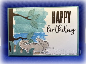 Today’s card is a little different. I wanted to use the crocodile/alligator image from the Jungle Pals stamp set but I wanted to create a seaside look. I stamped the sand image from the Oceanfront stamp set onto the lower left hand corner of Basic White card using Crumb Cake ink. I stamped the sea image from the same stamp set using Azure Afternoon ink.
