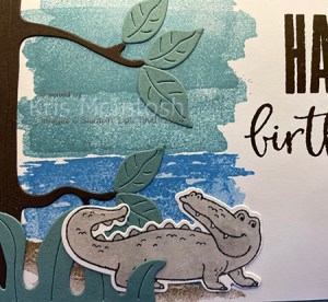 I stamped the sky image using Balmy Blue ink. I die cut Early Espresso card using the tree die from the Jungle Pals Dies and attached it down the left hand side of the stamped card. I die cut the leaves from Lost Lagoon card and attached them to the tree.