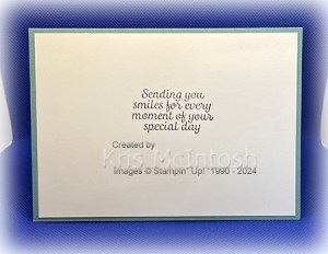 I also die cut Lost Lagoon card using the grass die from the Jungle Pals Dies. I stamped the crocodile/alligator image onto Basic White card using Memento Tuxedo Black ink and coloured it using the Gray Granite Stampin’ Blends. I layered the grass and the crocodile images onto the card front. I stamped “happy” and “birthday” from the Biggest Wish stamp set onto the right hand side of the Basic White card using Early Espresso ink. The whole panel is attached to scored and folded Lost Lagoon card. To decorate the inside of the card I stamped one of the greetings from the Very Best Occasions stamp set onto Basic White card using Lost Lagoon ink.