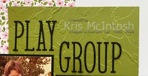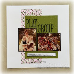 Today’s page shows off some photos from we lived in Kew. I joined the playgroup in Laurieton and made lots of friends. As you can see this was a huge playgroup. I attached a piece of Delightfully Eclectic 12″ x 12″ Designer Series Paper to the left hand side of a Basic White 12″ x 12″ page. I embossed a piece of Old Olive card using the Painted Texture 3D Embossing Folder and attached it so that it partially covers the Designer Series Paper.
