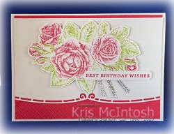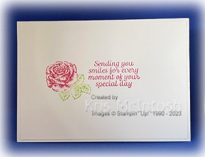 I stamped the greeting from the Stippled Roses stamp set onto Basic White card using Sweet Sorbet ink and cut it out using one of the banners from the Sending Dies. I attached the greeting to the card front using dimensionals where necessary. To decorate the inside of the card, I stamped a greeting from the Very Best Occasions stamp set onto Basic White card using Sweet Sorbet ink. I coloured the small floral image from the Stippled Roses stamp set using the Sweet Sorbet and Parakeet Party Stampin’ Write Blends and stamped it beside the greeting. This is such a lovely stamp set, one that I am sure I will get to use quite a lot.