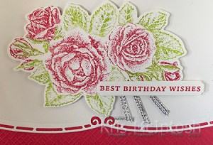 I inked the large floral image from the Stippled Roses stamp set using the Sweet Sorbet and Parakeet Party Stampin’ Write Blends. I cut out the image using the co-ordinating Stippled Roses Die. I attached pieces of Silver ribbon from the Gold & Silver 1/8″ Trim Combo Pack to the back of the die cut before attaching it to the card front using dimensionals.