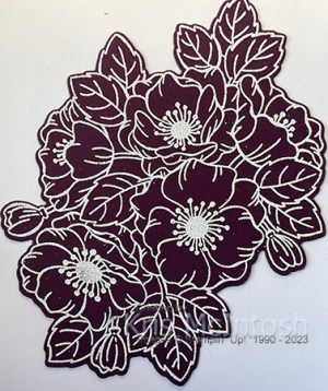 I stamped the large floral image from the Enduring Beauty stamp set onto Blackberry Bliss card using Versamark ink and sprinkled it with White Embossing Powder. I heat set the image before cutting it out using the co-ordinating Enduring Beauty Die and attaching it to the card front.