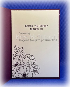To decorate the inside of the card, I stamped another greeting from the Charming Sentiments stamp set onto Basic White card using Blackberry Bliss ink. I also stamped part of the large floral image from the Enduring Beauty stamp set onto the lower left hand corner using Blackberry Bliss ink. A simple card but I just adore this image, don’t you?