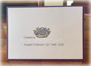 Today’s card again uses product from the Meandering Meadows Collection. I stamped the greeting from the Garden Meadow stamp set onto the upper right hand corner of a piece of Basic White card using Gorgeous Grape ink. I attached a piece of Meandering Meadows 6″ x 6″ Designer Series Paper across the bottom of the stamped Basic White card.