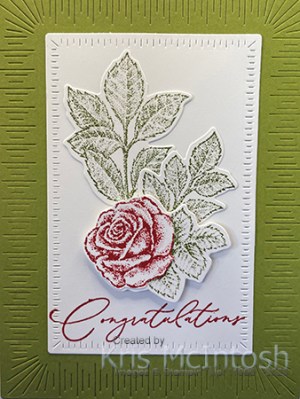 I stamped the small rose onto Basic White card once using Old Olive ink and once using Real Red ink. I cut out the images using the co-ordinating Stippled Roses Dies. I trimmed the leaves from the Real Red floral image and attached the rose onto the Old Olive image