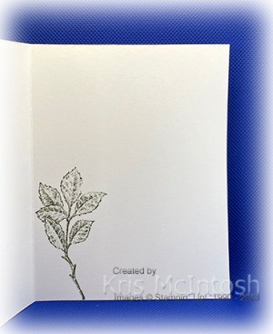 I trimmed the leaf image into two pieces and attached them both to the stamped Basic White panel. I attached the floral image over the top using dimensionals. The whole panel is attached to Thick Basic White card. To decorate the inside of the card, I inked only the bottom section of the leaf image and stamped onto the lower left hand corner.