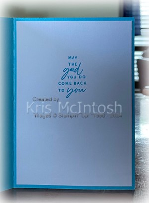 After colouring the image and attaching it to the card front, I stamped “thank you” from the Something Fancy stamp set onto Basic White card using Tahitian Tide ink. I cut out the greeting using the smallest circle from the Everyday Details Dies and attached it to the card front using dimensionals where necessary, so that it slightly overlaps the image panel. To decorate the inside of this card, I stamped the same greeting as before onto Basic White card using Tahitian Tide ink. I cut across the bottom of the stamped Basic White card using the border die from the Everyday Details Dies.