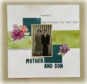 My page today shows off a photo of my Dad with his Mum taken at his cousin’s 21st birthday. I am not sure how old my Dad is but I am thinking late teens. I cut pieces of the Delightful Floral 12″ x 12″ Designer Series Paper and attached them to a Basic White 12″ x 12″ page. I attached my photo to the page, this is the original photo as I couldn’t get a clear picture when I scanned and edited it. I cut flowers from the Delightful Floral Designer Series Paper and attached them to page on each side of the photo. I cut Shaded Spruce card using the Mini Alphabet Die to create the title which I attached below the photo. I used the retired Journaling pen to add some information to the left hand side of the page. I love this simple page, don’t you? I especially love that this paper is still available as an Online Exclusive.