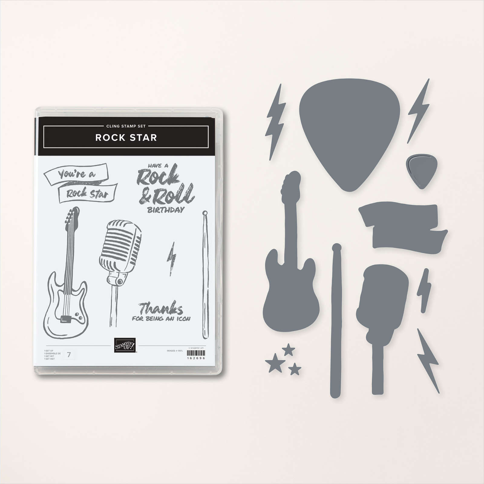 Today’s card features a product suite that will be retiring at the end of the month. It also features one of the card sketches which Stampin’ Up! has kindly shared on page 22 of the 2024-2025 Annual Catalogue. I shared some cards made using this card sketch in my Facebook Live this week also. I cut two pieces of the Rock & Roll 12″ x 12″ Designer Series Paper and attached them to Basic White card. The panel is attached to scored and folded Basic Black card. I die cut Basic Black card using the large pick die from the Rock Star Dies and attached it to the card front.