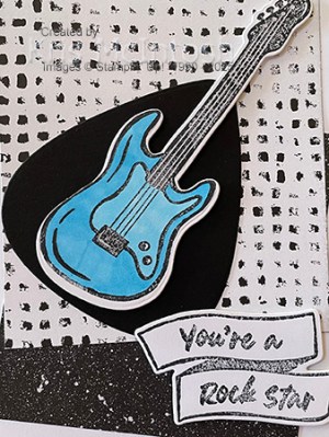 I stamped the guitar image from the Rock Star stamp set onto Basic White card using Memento Tuxedo Black ink. I cut out the image using the co-ordinating Rock Star Die before colouring it using Tahitian Tide and Light Smoky Slate Stampin’ Blends. I attached the image to the card front using dimensionals. I stamped the greeting from the Rock Star stamp set onto Basic White card using Memento Tuxedo Black ink and cut it out using the co-ordinating Rock Star Die.
