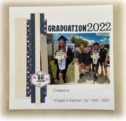 Today’s page shows off some photos taken at my eldest daughter’s graduation from High School a couple of years ago. I attached pieces of the Delightfully Eclectic 12″ x 12″ Designer Series Paper to the left hand sided of a Basic White 12″ x 12″ page. Unfortunately this Designer Series Paper is retiring at the end of the month. I attached my photos to the right hand side of the page, partially covering the Designer Series Paper. I cut “graduation” from Night of Navy card using the Mini Alphabet Die. I stamped “2022” onto Basic White card using the Classic Letters stamp set and Night of Navy ink. I cut out the numbers and attached them to the page. I stamped the outline from the Heartfelt Hexagon stamp set onto Basic White card using Night of Navy ink. I stamped the greeting from the retired A Grand Kid stamp set inside the outline using Night of Navy ink. I stamped three hearts around the greeting using the Heartfelt Hexagon stamp set and Fresh Freesia ink. The image is punched out using the Heartfelt Hexagon Punch before being attached to the page. Another simple page but one that brings many happy memories to mind.