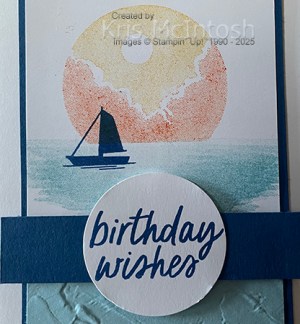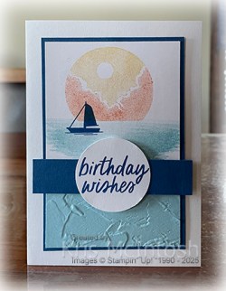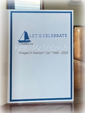 I attached the panel to the front of scored and folded Thick Basic White card. I attached a narrow strip of Blueberry Bushel card across the card front using dimensionals so that it covered where the stamped and embossed card meet. I stamped “birthday wishes” from the Simply Said stamp set onto Basic White card using Blueberry Bushel ink and punched it out using the 1-3/4″ Circle Punch. The greeting is attached to the card front using dimensionals where necessary. To decorate the inside of the card, I stamped another greeting from the Simply Said stamp set onto Basic White card using Blueberry Bushel ink. I also stamped the boat image from the Under the Moon stamp set beside the greeting using Blueberry Bushel ink. The stamped card is attached to Blueberry Bushel and then to the inside of the card base. This is such a lovely stamp set, one of many in the new catalogue.