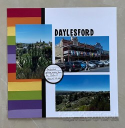 On our recent road trip we stayed at Dalyesford in Victoria. Such a pretty little town which was getting ready for its annual Chillout Festival, so we could only stay one night. For my page I decided to add strips of Real Red, Pumpkin Pie, Daffodil Delight, Granny Apple Green, Gorgeous Grape and Highland Heather down to the left hand side of a Basic White 12″ x 12″ page. I added a strip of Basic Black card down the right hand edge of the strips of card before attaching my photos. I cut the title from Basic Black card using the Mini Alphabet Dies (I bet you didn’t know I love these dies!). For my journaling I stamped a piece of Basic White card using the line stamp from the Love This Moment stamp set and Memento Tuxedo Black ink. I punched out the lines using the 2″ Circle punch and added my journaling. I attached the Basic White circle to a 2-1/4″ Circle (sorry this punch is retired) before attaching to the page. Such a simple page but reminds of our stay in this lovely little town.