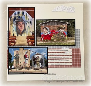 When we were leaving Wangaratta on our Great Ocean Road Road Trip we decided to do part of the Silo Trail from Benalla to Tungamah on our way to Bendigo. Today’s pages show off some photos from our first stop at Goorambat. The silo art work was amazing and so was the Sophia in the Uniting Church. I attached pieces of the Take to the Sky 12″ x 12″ Designer Series Paper across the bottom of two Very Vanilla 12″ x 12″ pages. I did cut a “V” in the edge of the paper on the left hand page. I attached all of my photos to Basic Black card before attaching them to the pages. I didn’t attach the right hand side of the bottom photo on the right hand page. I stamped one large, two medium and three small clouds from the Adventurous Sky stamp set onto Basic White card using Smoky Slate ink.