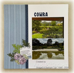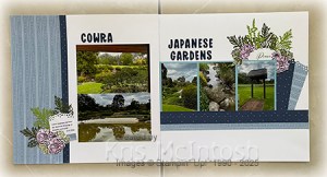 Another great place to visit if you are in Cowra, the gardens are amazing, so beautiful and so peaceful. For my first page I attached a piece of Balmy Blue Countryside Inn 12″ x12″ Designer Series Paper to the left hand side of a Basic White 12″ x 12″ page. I attached a narrow strip of Night of Navy Designer Series Paper next to the larger piece. I also added two photos.