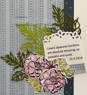 I printed my journaling onto Basic White card and punched the top using the Elegant Edge Tag Topper Punch I die cut two sets of leaves from Mossy Meadow card and one leaf from Granny Apple Green card using the Flowers of Beauty Dies. I also stamped the large outline flower twice onto Basic White card using Blackberry Bliss ink. I stamped the fill images using Blackberry Bliss ink which I stamped onto scrap paper first. I also stamped one outline small flower and fill image using the same technique and ink.
