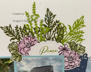 The title is cut from Night of Navy card using the Mini Alphabet Dies. I cut strips of the Countryside Designer Series Paper and attached them across the lower section of the second Basic White 12″ x 12″ page. I attached my photos to Balmy Blue card. I die cut several more leaves and stamped and die cut flowers and leaves as before. I also cut tags from the Designer Series Paper and punched the top using the Elegant Edge Tag Topper Punch. I stamped “Peace” from the Unbounded Love stamp set onto Basic White card using Granny Apple Green ink. I cut out the greeting using one of the Unbounded Love Dies. The tags, flowers and greeting are layered together around and over the upper right hand corner of the photo panel. The title is again cut from Night of Navy card using the Mini Alphabet Dies.