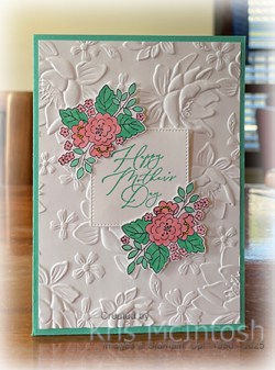 Today’s card uses a few pieces that have been sitting on my desk for a while! I embossed Basic White card using the Layered Florals 3D Embossing Folder. The embossed panel is attached to scored and folded Summer Splash card. I stamped the greeting from the Stippled Roses stamp set onto Basic White card using Summer Splash ink. I cut out the greeting using one of the Stylish Shapes Dies. I attached the greeting to the centre of the embossed Basic White card. I stamped the floral images from the Love This Moment stamp set twice onto Basic White card using Memento Tuxedo Black ink.