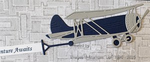 I also cut the propellor from Smoky Slate card and attached it to the front of the plane image. I couldn’t find just the right greeting so I printed “adventure awaits” onto Basic White card and used the banner from the Adventurous Sky Dies to cut it out. I also die cut the banner attachment from Night of Navy card using the same dies. I layered the banner attachment die onto the end of the banner before attaching them to the card front (and of course making sure to attach it to the plane).