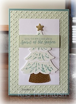 Have you seen the card templates in the new Stampin’ Up! annual catalogue? Take a look at page 22 and you will find 22 different ideas for creating cards. During my Facebook Live this week I shared a few cards using Template Fourteen and today I have another idea for you. I embossed Soft Sea Foam card using the Metal 3D Embossing Folder and attached it to scored and folded Lost Lagoon card. I cut a piece of Basic White card and attached it to the centre of the card front. I stamped the solid tree image from the Merriest Trees stamp set onto Basic White card using Soft Sea Foam ink.