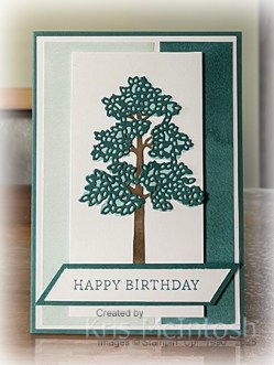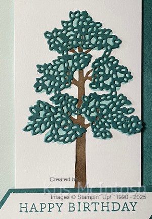 I cut the detailed tree image from Pretty Peacock card using the Frosted Forest Die. I attached the die over the sponged branch image. I stamped “happy birthday” from the Simply Said stamp set onto Basic White card using Pretty Peacock ink. I trimmed around the greeting and attached it to Pretty Peacock card.
