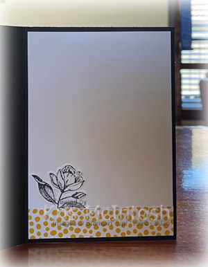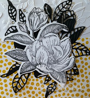 I also die cut two small leaves using the Magnolia Mood Dies also from Basic Black card. I attached all of the die cut images to the card front. I stamped the large floral image from the Magnolia Mood stamp set onto Basic White card using Memento Tuxedo Black ink. The image is cut out using the co-ordinating Magnolia Mood Die. I attached the stamped image to the card front over the die cut images using dimensionals.