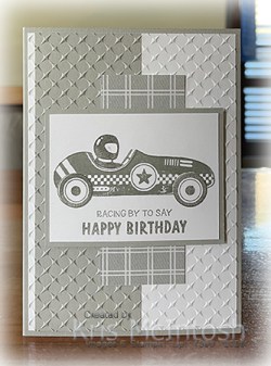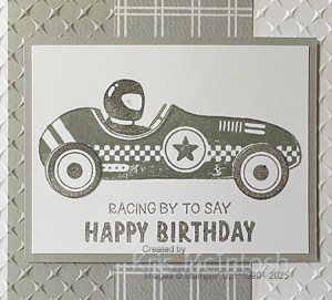I stamped the solid car image from the Racing By stamp set onto Basic White card using Smoky Slate ink. I stamped the detailed car image from the Racing By stamp set over the top using Basic Gray ink. I also added the wheel image and the helmet image from the same stamp set using Basic Gray ink.