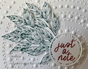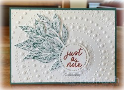 Today’s card uses a new embossing folder and I think it is the first time I have used it. I embossed Basic Whtie card using the Dotted Circles 3D Embossing Folder and attached it to scored and folded Pretty Peacock card. I stamped the leaf image from the Spotlight on Nature stamp set onto Basic White card three times using Pretty Peacock ink.