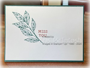 The greeting is attached to the card front using dimensionals. To decorate the inside of the card, I stamped the leaf from the Spotlight on Nature stamp set onto the left hand side of Basic White card using Pretty Peacock ink. I stamped the greeting from the Simply Said stamp set beside the leaf using Cajun Craze ink. A simple card but pretty, don’t you think?