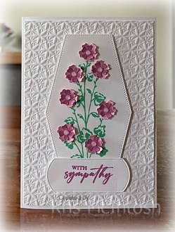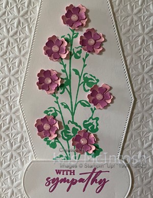 I attached seven of these flowers to the stamped leafy image. I added a Pretty in Pink 2024-2026 In Colour Shimmer Gem to the centre of each flower. The die cut panel is attached to the embossed card front using dimensionals. I stamped “with sympathy” from the Unbounded Love stamp set onto Basic White card using Petunia Pop ink.