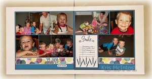 To disguise the join in the paper on the left hand page I stamped “happy” from the Love This Moment stamp set onto Basic White card using Misty Moonlight ink and fussy cut it. The “H” covers the join perfectly. I stamped only the “birthday” from the happy birthday greeting in the Simply Said stamp set onto Basic White card using Misty Moonlight ink. I used one of the banners from the Greetings of the Season Dies to cut around the greeting before attaching it to the page. I stamped “smile” and two of the camera images from the Love This Moment stamp set onto Basic White card using Misty Moonlight ink. I stamped the line image from the same stamp set twice below the greeting using Misty Moonlight ink. I also stamped the solid candle image from the Iconic Imagery stamp set across the bottom of the panel using Misty Moonlight ink. I stamped the flame image from the same stamp set onto each of the candles using Daffodil Delight ink. I hand wrote my journaling. This panel is attached to Misty Moonlight card and then the right hand page.