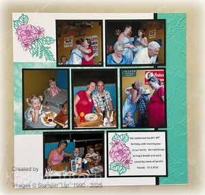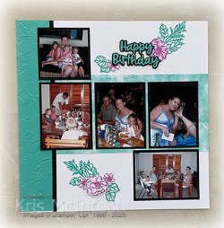 Today’s page shows off some photos from my eldest daughter’s birthday back in 2010. We celebrated with cake at my house in the morning and dinner at Hog’s Breath in the evening. I embossed strips of Summer Splash card using the Painted Texture 3D Embossing Folder. This folder is very forgiving and lets me emboss several times to cover the whole strip without looking “wrong”. I attached the embossed panels down the outside edges of Basic White 12″ x 12″ pages.
