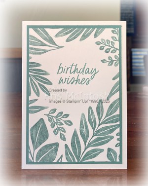 of stamping the same card using the Leaf Collection stamp. I used a Lost Lagoon Stampin’ Write Marker to colour some of the leaves on the Leaf Collection stamp. I stamped the images onto Basic White card which I trimmed down. Each time I inked the Leaf Collection stamp, I added more leaves.