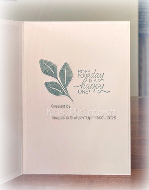 Each of the stamped panels is attached to Lost Lagoon card and then scored and folded Thick Basic White card. To decorate the inside of the card, I stamped the greeting from the So Sincere stamp set onto Basic White card using Lost Lagoon ink. I inked a single leaf from the Leaf Collection using a Lost Lagoon Stampin’ Write Marker and stamped the image three times onto Basic White card. I cut out the leaves and attached one to each of the card inserts before attaching the panel to the inside of the card base.