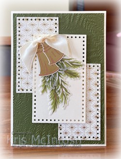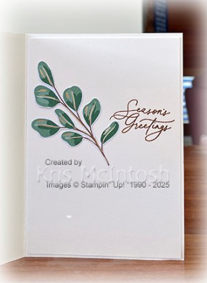I tied a knot in a length of Very Vanilla 3/4″ Satin Ribbon and attached it to the top of the bells using a Mini Glue Dot. The image panel is attached to the card front using dimensionals. To decorate the inside of the card, I stamped the greeting from the Greetings of the Season stamp set onto Basic White card using Cherry Cobbler ink. I cut the leafy image from the Season of Green & Gold 12″ x 12″ Specialty Paper. The leaf is attached next to the greeting. Another card using this fabulous collection that I truly love.