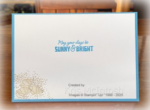 I stamped the “sand” image from the Surfing Santa stamp set three times onto the lower left hand corner of the Basic White card using Crumb Cake ink. I stamped the shell image from the Surfing Santa stamp set three times onto Basic White card using Crumb Cake ink. I coloured the image using the Light Crumb Cake Stampin’ Blend before cutting out the shells. I attached the shells over the stamped “sand”. I love how bright & happy this card is and this Santa certainly fits our hot summer Christmas.