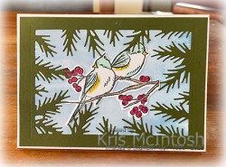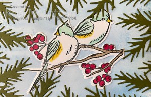 I let the paper dry and used the block to weigh it down so that it dried pretty flat. I die cut Mossy Meadow card using the leafy frame die and attached it to the watercoloured paper. The whole panel is attached to scored and folded Thick Basic White card. I stamped the double bird image from the Winterly Tree Tops stamp set onto Basic White card and used Pool Party, Daffodil Delight, Crumb Cake and Cherry Cobbler Stampin’ Blends to colour the image.