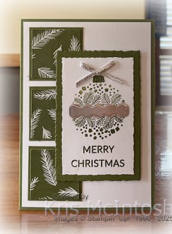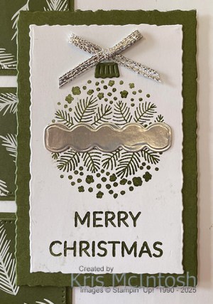I stamped one of the ornament images from the Hang an Ornament stamp set onto the Basic White Rectangle using Mossy Meadow ink. I stamped “merry Christmas” across the bottom of the panel using Mossy Meadow ink and the Greetings of the Season stamp set. I cut Silver Foil card using the Hang an Ornament Die and attached it across the middle of the stamped ornament.