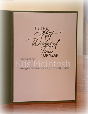 I cut Mossy Meadow card using the Hang an Ornament Die and attached it to the top of the stamped ornament. I attached the Basic White rectangle to the Mossy Meadow Rectangle and attached it to the card front using dimensionals. I tied a bow in a length of Silver Trim from the Gold & Silver 1/8″ Trim Combo Pack and attached it to the top of the ornament using a glue dot. To decorate the inside of the card, I stamped another greeting from the Greetings of the Season stamp set onto Basic White card. I love how the Mossy Meadow colour seems to pop off the card front and give so much dimension, don’t you?