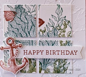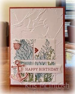 Today I am trying out another card sketch that I found here on Pinterest. I embossed Basic White card using the Painted Texture 3D Embossing Folder and attached it to scored and folded Cajun Craze ink. I stamped the largest seaweed image from the Beauty of the Deep stamp set onto Basic White card using Pretty Peacock ink. I masked the image and stamped the long seaweed image using Shaded Spruce ink. I also stamped the smaller seaweed image using Old Olive ink. I stamped a couple of the small fish image from the Beauty of the Deep stamp set around and over the seaweed images.