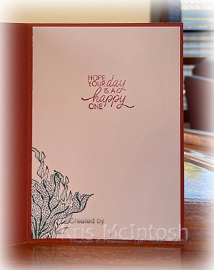 I stamped the anchor image from the Beauty of the Deep stamp set onto scrap Basic White card and cut it out using the co-ordinating Beauty of the Deep Die. The anchor is attached over the end of the greeting banner using dimensionals where necessary. To decorate the inside of the card, I stamped the greeting from the So Sincere stamp set using Cajun Craze ink. I stamped the large seaweed image onto the lower left hand corner of the stamped Basic White card using Pretty Peacock ink. I masked the image and stamped the tall seaweed image over the top twice using Shaded Spruce ink. I am not quite sure whether I like the finished card or not. What do you think?
