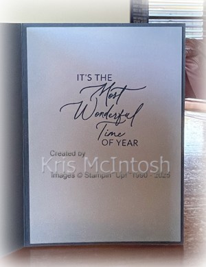 Lauren used Embossing Paste to add the last layer to the trees but I didn’t have any so I used Craft White ink to add the last layer. I sponged some Misty Moonlight ink around the edge of the panel. I attached a narrow strip of Silver Foil card behind the left hand side of the tree panel before attaching it to the card front using dimensionals. I stamped “merry” and “Christmas” from the Greetings of The Season stamp set onto Basic White card using Misty Moonlight ink.