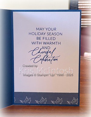 This week in my Facebook Live I shared some cards I created using the Festive Words Stamp Set. Today I have another card to share with you. For this card, I cut two pieces of Iconic Celebrations 6″ x 6″ Designer Series Paper and attached them to Basic White card. I cut a strip of Blueberry Bushel card and attached it across the Designer Series Paper. The whole panel is attached to scored and folded Blueberry Bushel card. I stamped the image from the Festive Words stamp set onto Basic White card using Memento Tuxedo Black ink.