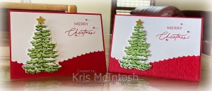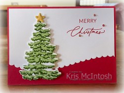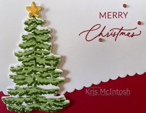 I created the tree using the Frosted Forest Decorative Masks and Garden Green ink. The tree is cut out using the coordinating Frosted Forest Die. I attached the tree to the card front using dimensionals. I stamped “Merry” and “Christmas” from the Greetings of the Season stamp set onto the right hand side of the Basic White card using Real Red ink.