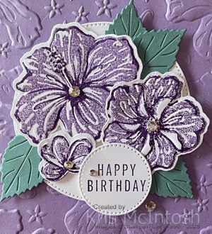My eldest granddaughter recently celebrated her birthday and today I am sharing the card I made for her. I embossed Highland Heather card using the Happy Hibiscus Hybrid Embossing Folder. The embossed panel is attached to scored and folded Gorgeous Grape card. I stamped the three flower outline image from the Happy Hibiscus stamp set onto Basic White card using Gorgeous Grape ink. I stamped the fill images for the three flowers using Highland Heather ink.