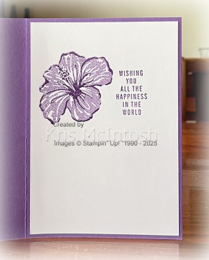 I attached the flowers, leaves and greeting to the large Basic White circle using dimensionals under the flowers, before attaching the whole panel to the card front. Just to give it a little “bling” I added some Basic Rhinestones to the flowers and the card front. To decorate the inside of the card, I stamped another greeting from the Translucent Floral stamp set onto Basic White card using Gorgeous Grape ink. I stamped the outline of the largest flower from the Happy Hibiscus stamp set three flower stamp beside the greeting using Gorgeous Grape ink. I stamped the fill image using Highland Heather ink. I truly love the gorgeous looks you can create using the Happy Hibiscus Bundle, don’t you?