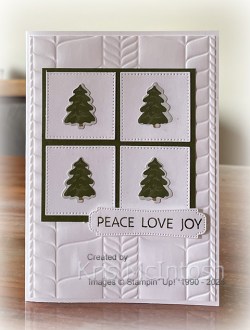 I die cut the trees from the Iconic Celebrations 6″ x 6″ Designer Series Paper using the Iconic Imagery Dies and attached one to each square. I stamped “Peace”, “Love” and “Joy” from the Iconic Imagery stamp set onto Basic White card using Mossy Meadow ink.